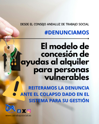El Consejo Andaluz de Trabajo Social vuelve a mostrar su profundo desacuerdo con el modelo de concesión de ayudas al alquiler para personas vulnerables, tras reproducirse hoy el colapso del sistema durante la convocatoria, lo que evidencia nuevamente las deficiencias del actual procedimiento.
